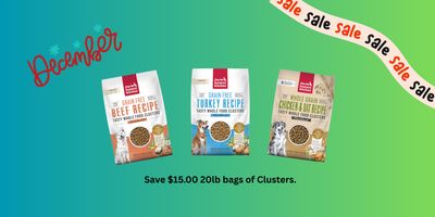 Save $15.00 on 20lb bags of Clusters, including Grain Free Turkey, Grain Free Beef, Whole Grain Chicken